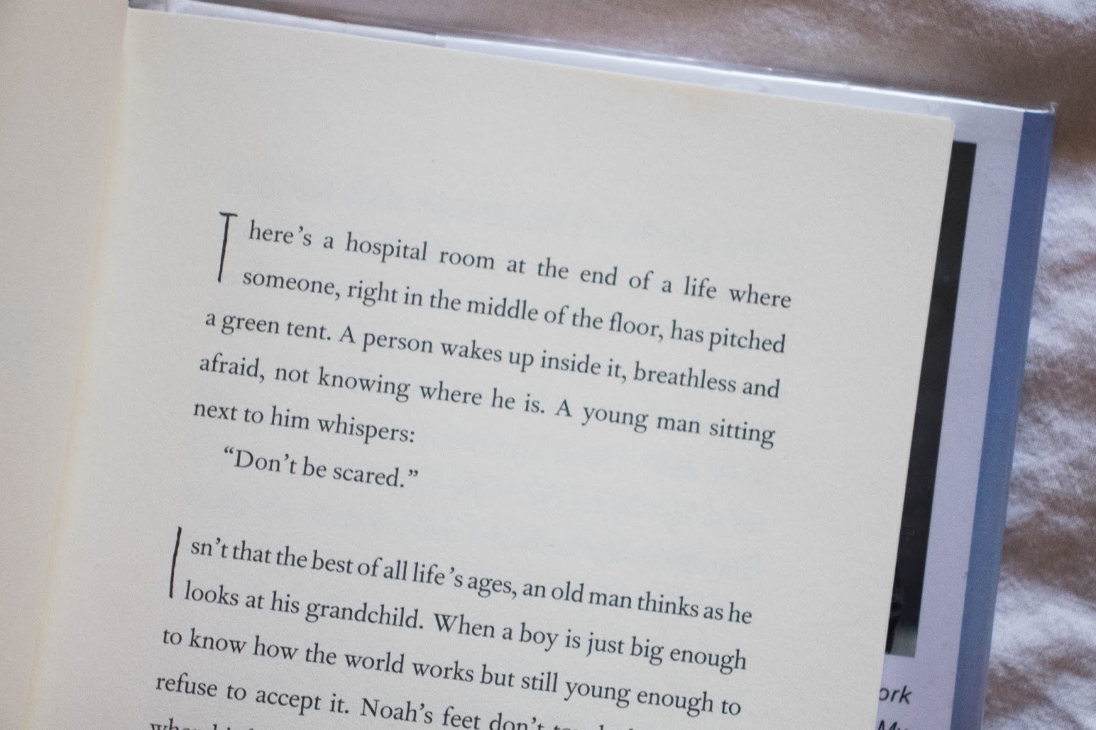 Grandpa and Noah are sitting on a bench in a square that keeps getting smaller every day. The square is strange but also familiar, full of the odds and ends that have made up their lives: Grandpa's work desk, the stuffed dragon that Grandpa once gave to Noah, the sweet-smelling hyacinths that Grandma loved to grow in her garden.