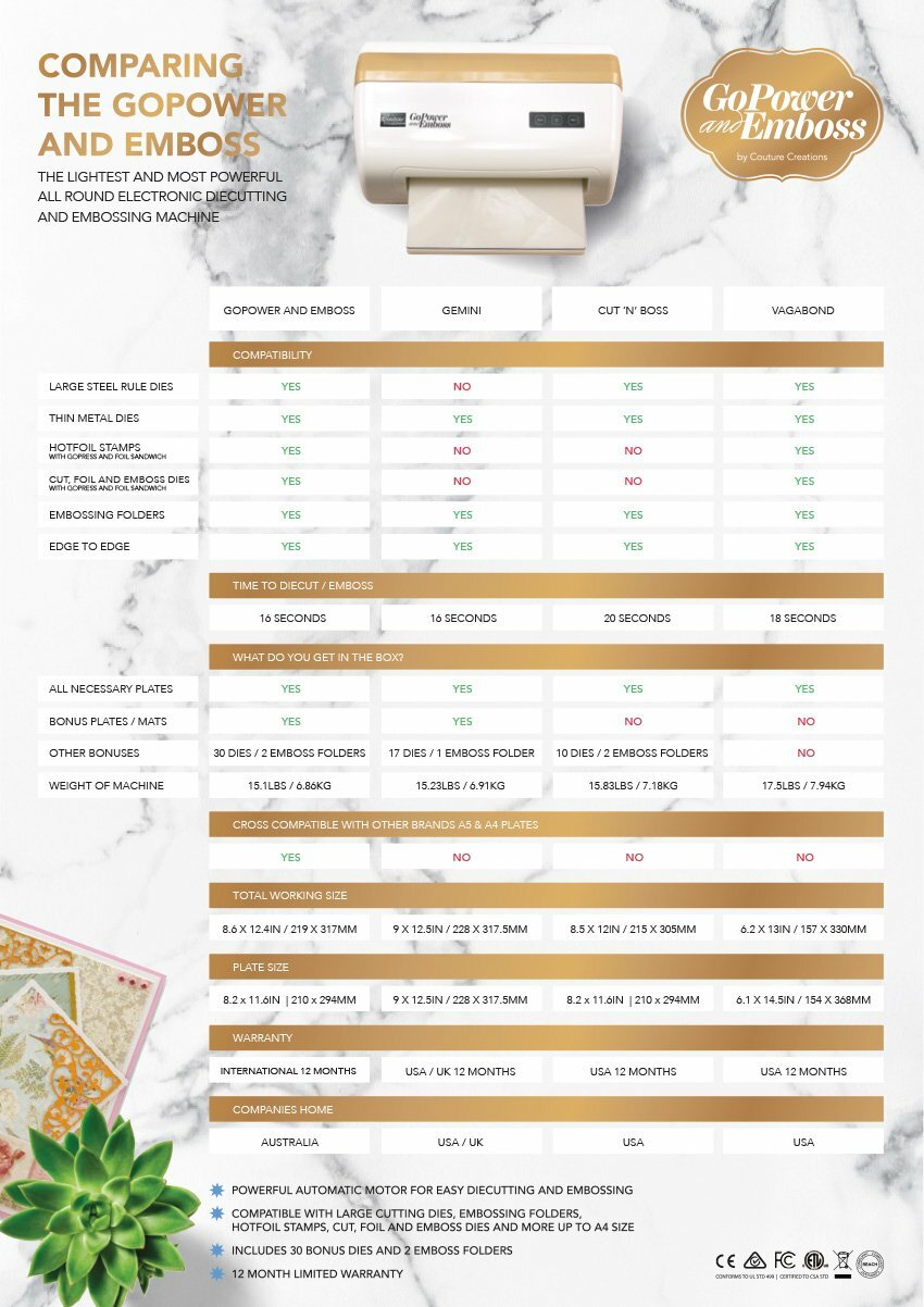 Couture Creations GoPower and Emboss Diecutting Machine SKU code: CO726520. Rated 5 / 5 based on 2 reviews. RRP $459.99. $399.00 SAVE $60.99 (13%). GoPower and Emboss machine from Couture Creations is an electronic and multipurpose die-cutting and embossing machine with a wide mouth and steadfast construction designed for use with all.