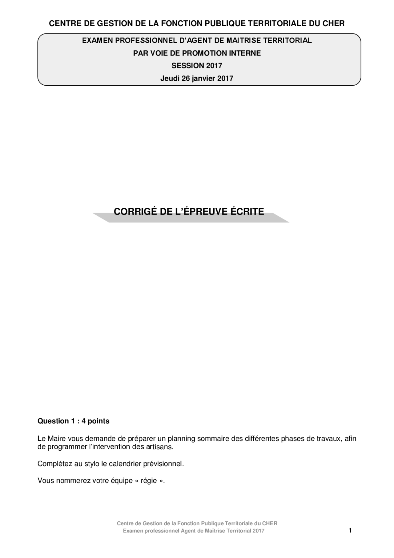 Corrigé de l’épreuve écrite examen professionnel d’agent de maitrise territorial par voie de