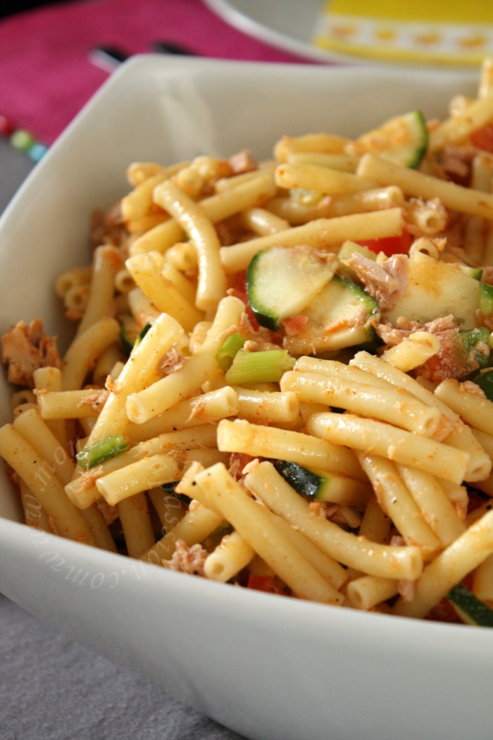 Préparation. 1. Cuire les pâtes en suivant les instructions sur l'emballage. Mélanger dans un bol les pâtes, le thon et les légumes. 2. Dans un bol, mélanger les ingrédients pour la sauce. L'ajouter à la salade de pâtes et mélanger.