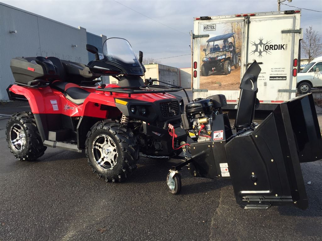 Souffleuse pour VTT, Premium 54" Berco. Requiert, boule de remorquage de 2" et treuil de 1000lbs sur le VU. Installation universelle . S'installe en moins de 5 minutes : Le système d'attache passe sous le véhicule, jusqu'à l'arrière et se fixe à la barre de remorquage. La longueur du châssis est ajustable selon le véhicule.