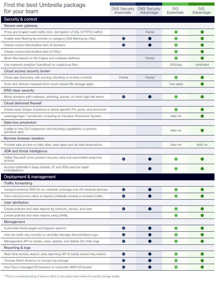 Learn how Cisco Umbrella's cybersecurity solutions can protect your network. Explore hundreds of ebooks, videos, analyst reports and more. - DNS Security Advantage Package - SIG Essentials Package - SIG Advantage Package; Umbrella Support Packages; Functionality. DNS-Layer Security.